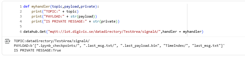 def my_handler(topic, payload, private): print("Got data:", topic, payload)datahub.Subscribe("mqtt://iot.digivis.se/datadirectory/TestArea/signalA", my_handler)