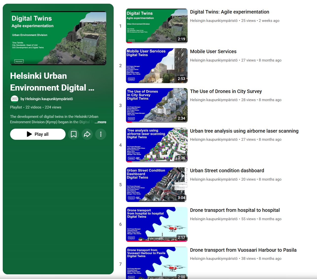 Helsingfors stad har under de senaste åren etablerat ett praktiska och verksamhetsnära program för digitala tvillingar. I en ny playlist med 22 korta videor visar stadens Urban Environment Division (Kymp) hur digitala tvillingar används i allt från stadsplanering till drift, service och miljöanalys.