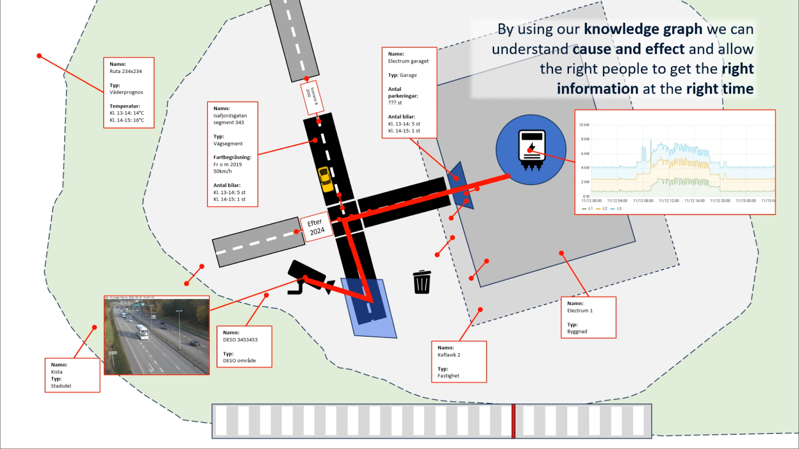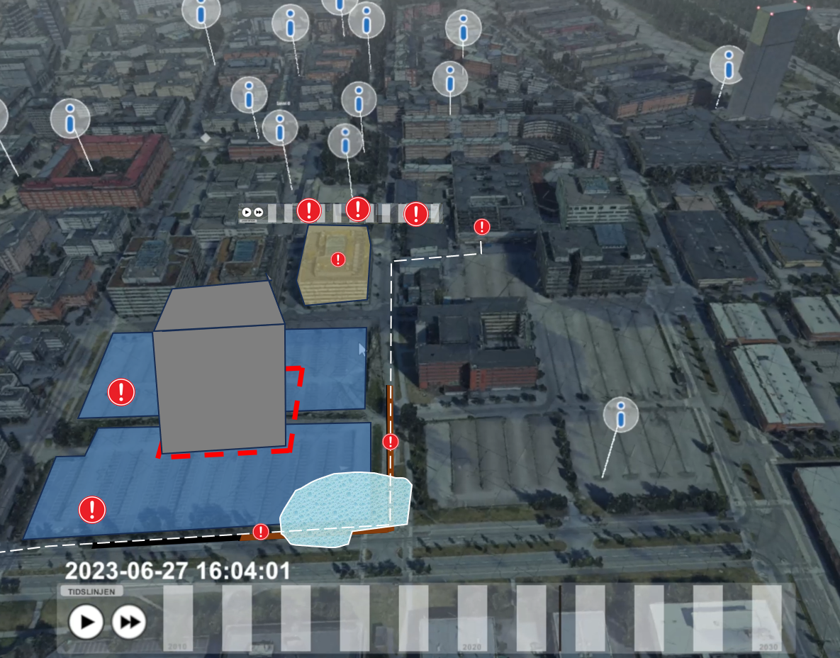 En av visionerna som utvecklats för arbetspaket är att vi baserat på ett antal händelse och en kunskapsgraf ska kunna skapa en skräddarsydd tidslinje för tex en fastighetsförvaltare i Kista där denne kan se var som påverkar verksamheten framöver. Alternativt att någon som planerar att bygga nytt i ett område kan bli lotsade till relevanta dataset tex situationen kring dagvatten eller trafik och tidigare utredningar.
