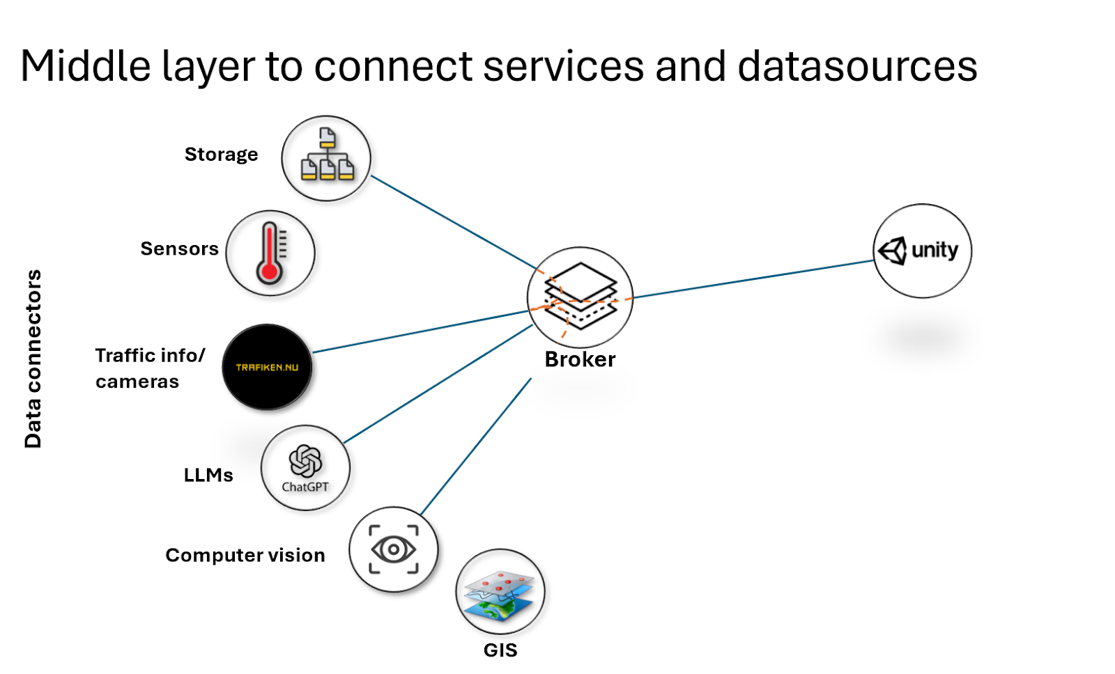 - En klient (Unity i bilden) ansluter till brokern och begär bland annat ut kamerabilder från en trafikkamera. Brokern ansluter upprättar en prenumeration som gör att alla nya bilder vidarebefordras till klienten. Sedan tidigare finns en koppling mellan en lagringstjänst (Storage) och kameraflödet som gör att klienten också kommer åt historiska bilder.