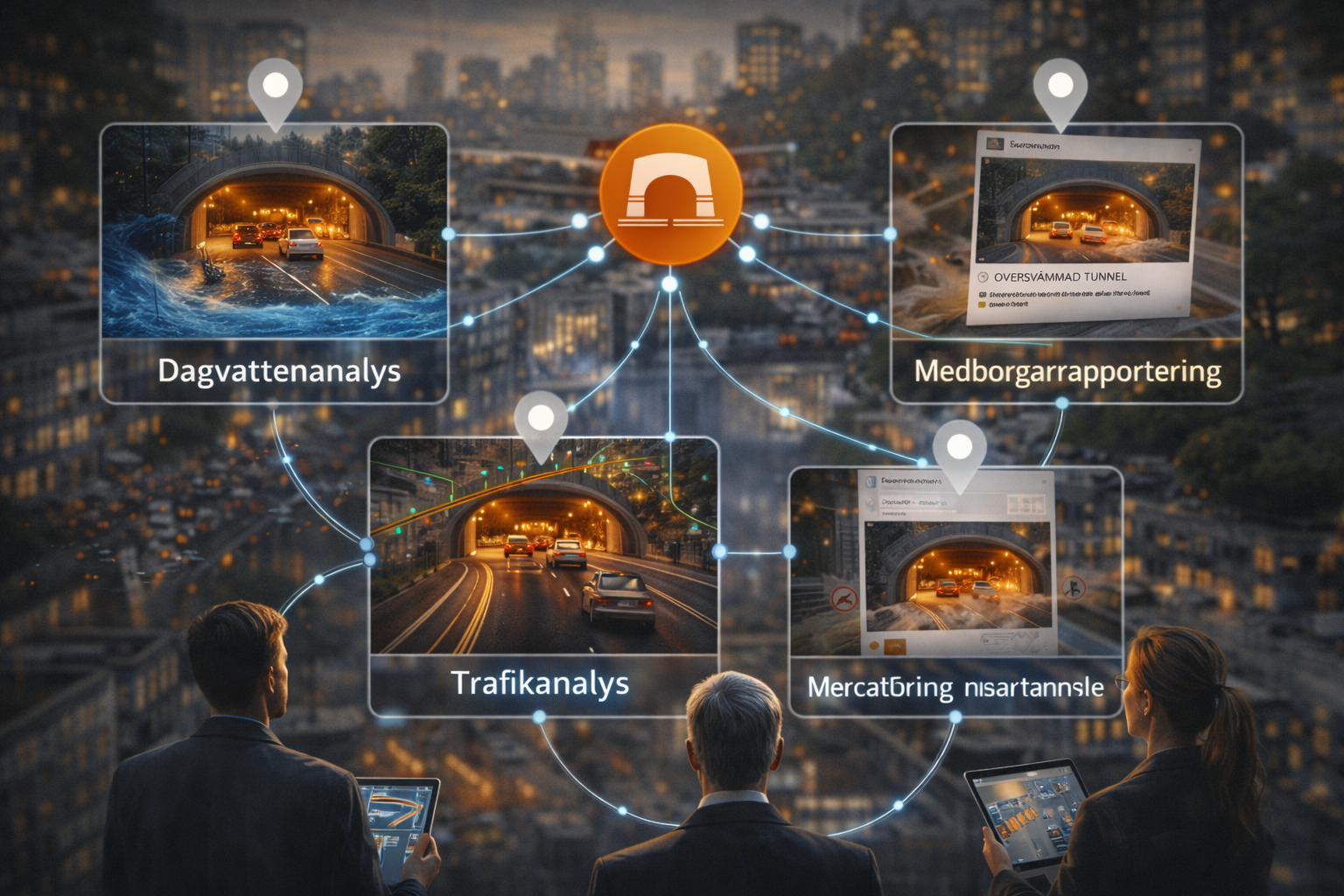 Att bygga en digital tvilling handlar i grunden om att koppla samman data till en meningsfull helhet och möjliggöra så kallade obrutna dataflöden där data - om det är önskvärt - i realtid kan gå från sensor, till beräkning och slutligen användaren. När detta lyckas kan vi skapa en synkroniserad förståelse för hur olika delar av staden hänger ihop och påverkar varandra, och motverka det tunnelseende eller åtskilda lägesbilder som ofta uppstår i eller mellan organisationer och förvaltningar. Ett sådant tunnelseende beror i stor utsträckning på begränsningar i möjligheten att se bortom den egna verksamhetens perspektiv, men kan också vara kopplade till just osynkade datamängder. Vi kommer lite senare att beskriva projektets vision med att rätt person dynamiskt ska få rätt information vid rätt tidpunkt.