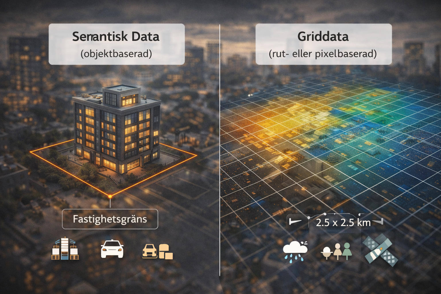 I projektet arbetade vi med flera olika datatyper kopplade till skilda geografiska indelningar. Dessa kan övergripande delas in i två huvudkategorier: semantisk data (objektbaserad) och rasterdata (grid-, rut- eller pixelbaserad).