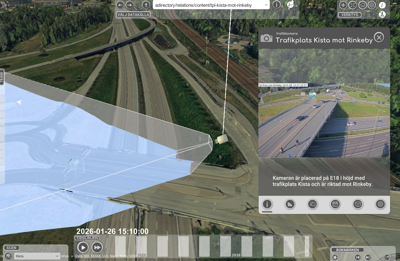 I projektet tittade vi också mycket på kamerabilder från tex trafikkameror eller kameror som vi satte upp över Ericssons parkeringar. I dessa fall så kommer kameras avkänningsområde att definieras som en så kallat frustum. Dvs en rektangel som växer med avståndet till kameran. Varje pixel i kameran kommer att falla på ett eller flera semantiska objekt så som vägar, hus, bilar, fastigheter osv. Om vi tex gör AI analys av bilden för att räkna bilar behöver vi sedan räkna om bildens koordinater till 3D modellens för att tex förstå vilken av filerna och i vilken riktning som bilen åker.