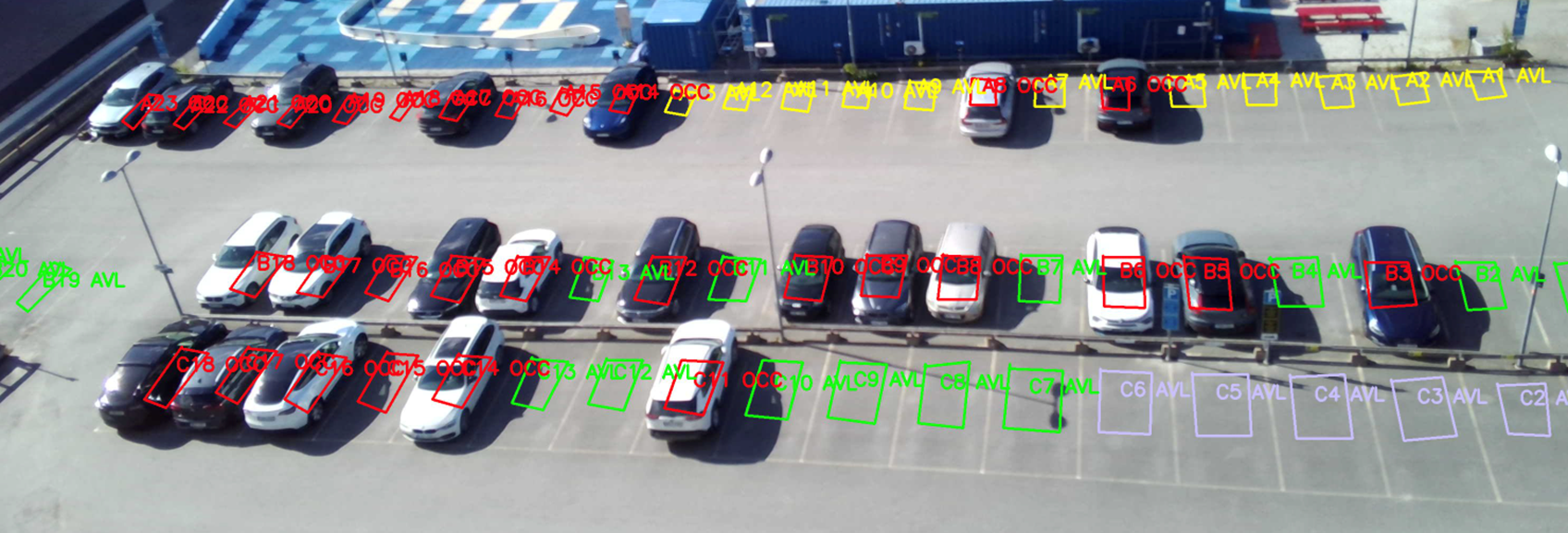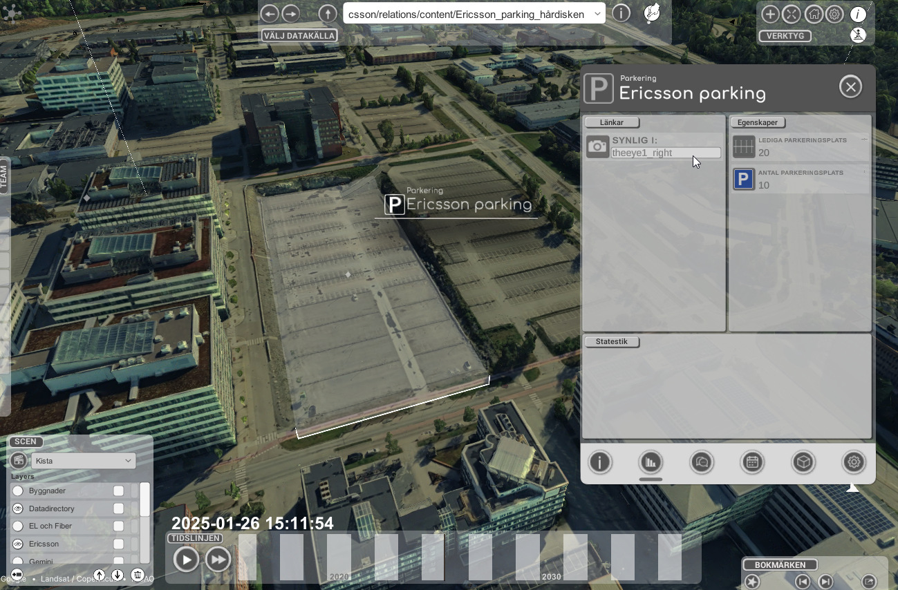 Som en del av läkningen av objekt så behöver vi också veta vilka kameror som ett visst objekt är sydliga i. I bilden har vi klickat på objektet Ericssons parkering i Kista och ser att den finns i kameran "theeye1_right" uppe i Kista science tower. Vi kan vidare även koppla exakt vilken parkering som motsvarar vilka pixlar i bilden som motsvara vilken parkerings ficka och på så sätt se vilken av parkeringarna som är ledig respektive upptagen.
