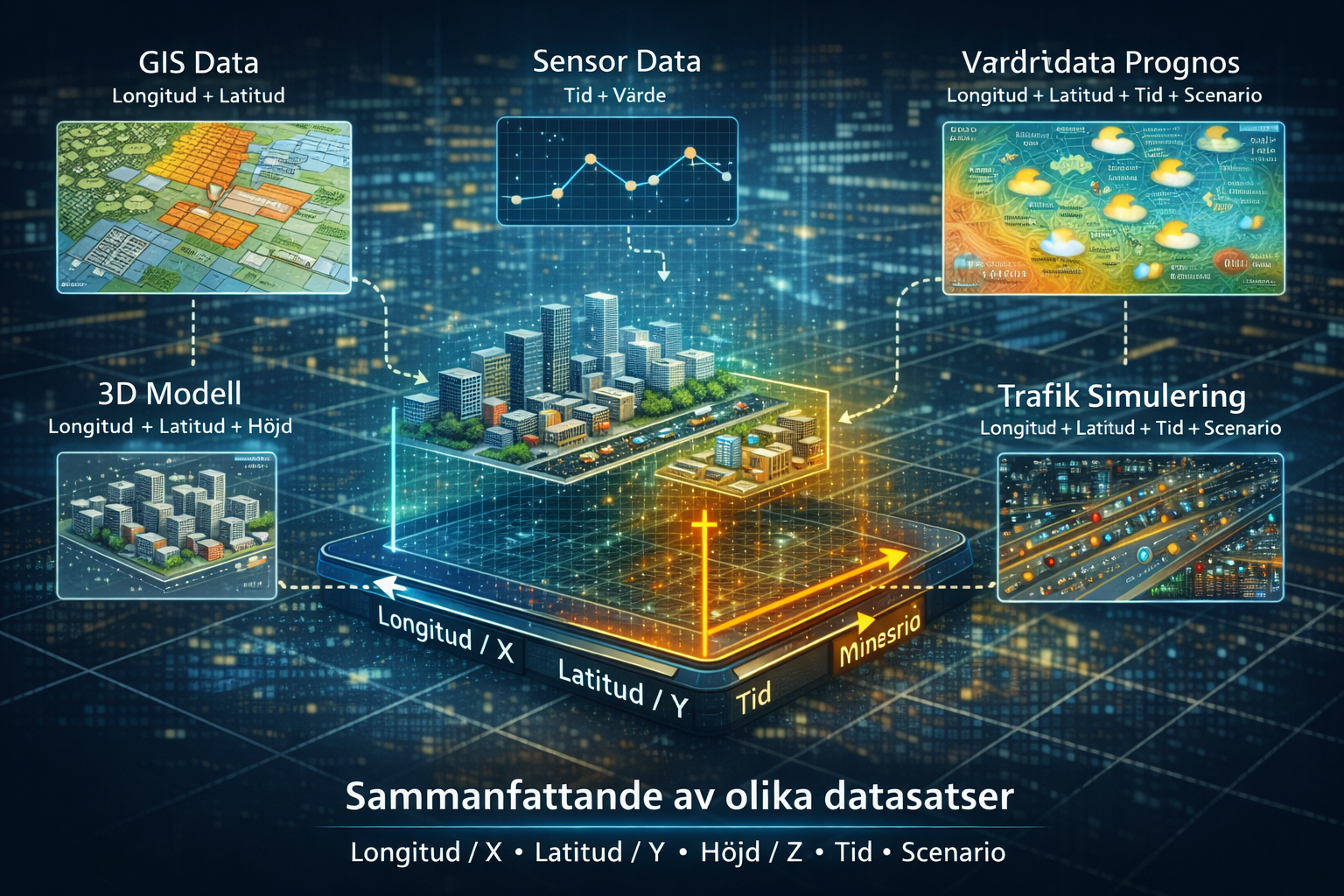 För 3D-modeller, exempelvis BIM, har vi normalt tre rumsliga dimensioner (X, Y, Z). Däremot har BIM ofta begränsat stöd för att hantera tid och scenarier på ett konsekvent sätt. Om vi i stället tar in simuleringsdata, till exempel trafik från verktyg som SUMO, får vi vanligtvis position över tid: ett fordon befinner sig på en viss plats vid en viss tidpunkt. Även här kan olika simuleringar representera olika scenarier.