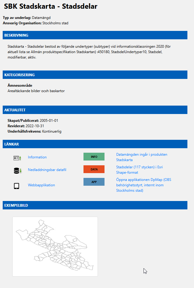 - Metadata – beskrivningen av datasetet (titel, nyckelord, ansvarig aktör).