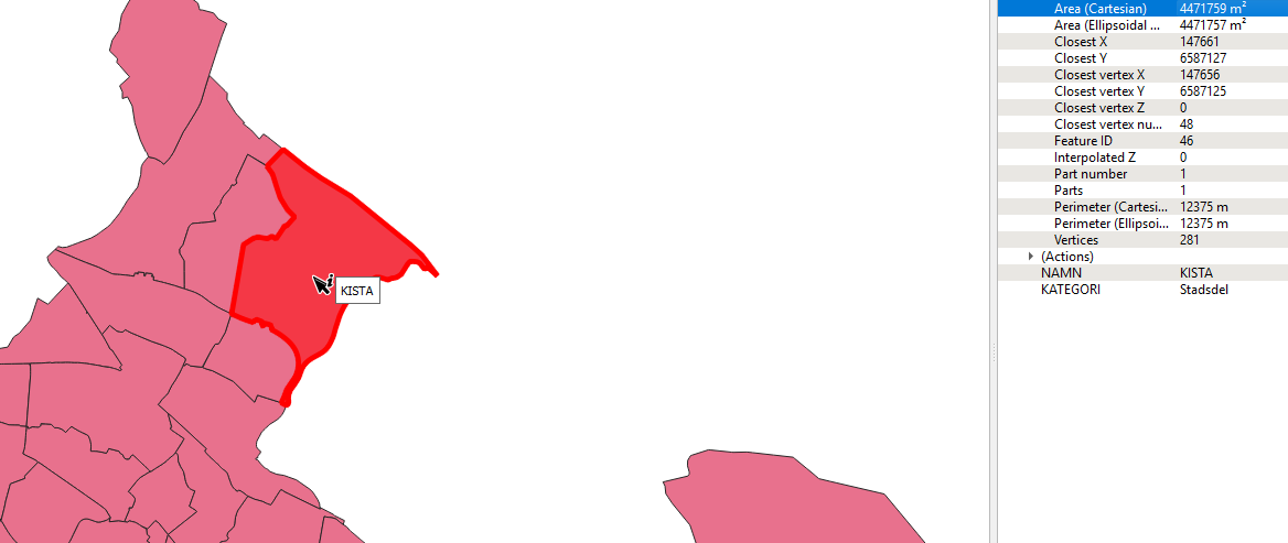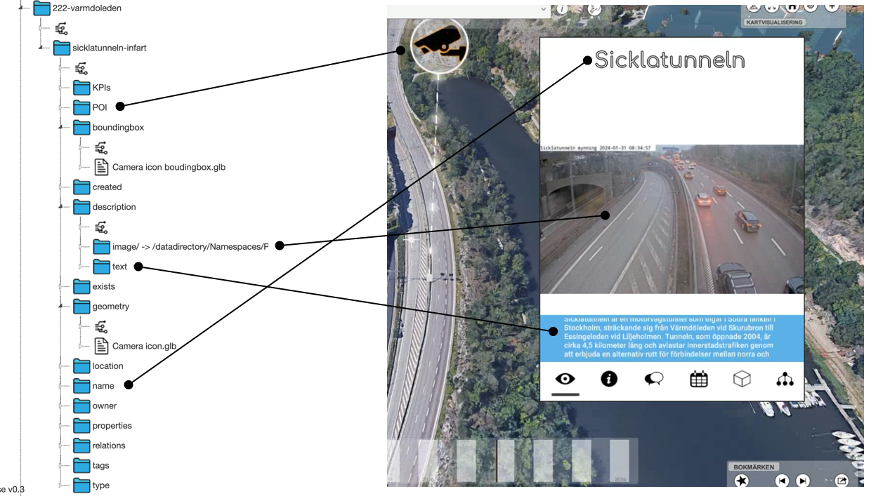 - Objekt och egenskaper – det faktiska innehållet i datan, exempelvis en plats som Kista, en byggnad eller en mätpunkt och deras attribut.
