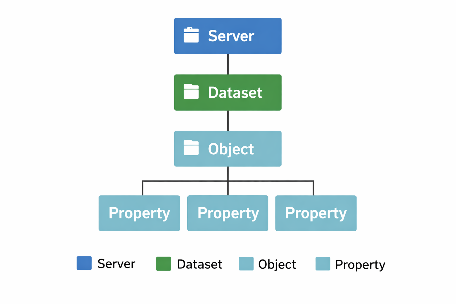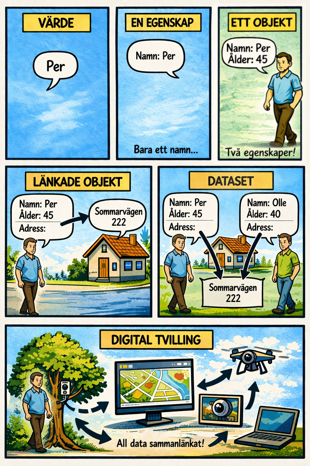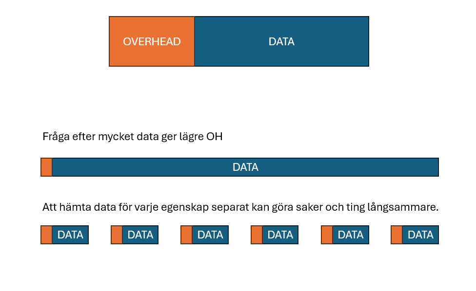 Alla dessa – egenskaper, objekt och dataset – kan lagras på samma sätt: som innehåll i en adress (sökväg). Skillnaden ligger alltså inte i tekniken, utan i hur vi väljer att strukturera informationen.