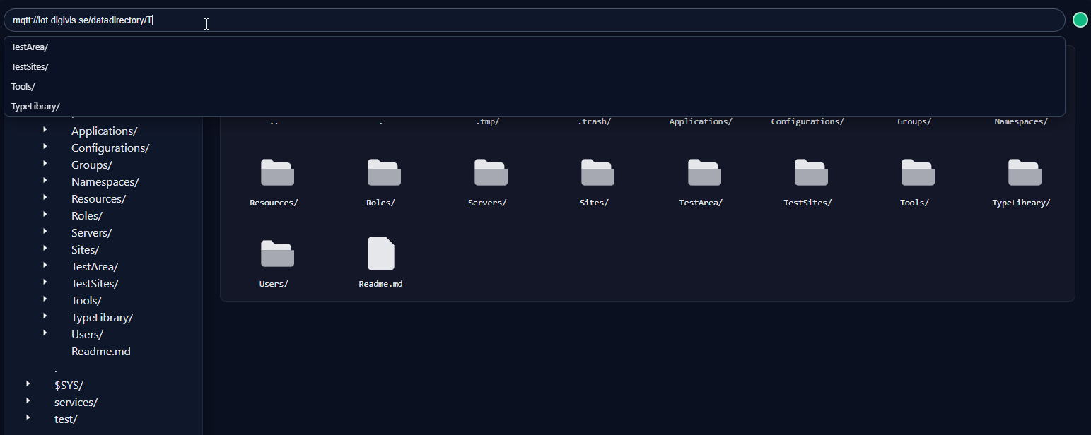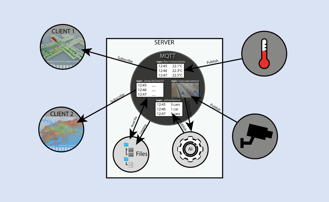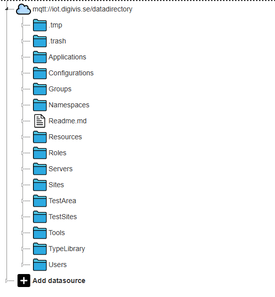 För detta skapade vi en särskild lagringsyta på servern, kallad datadirectory, där objekt och relaterad data kan sparas. Denna yta synkroniseras direkt mot en disk på servern, vilket innebär att ett MQTT-topic som exempelvismqtt://server1/datadirectory/min-katalog/signalA