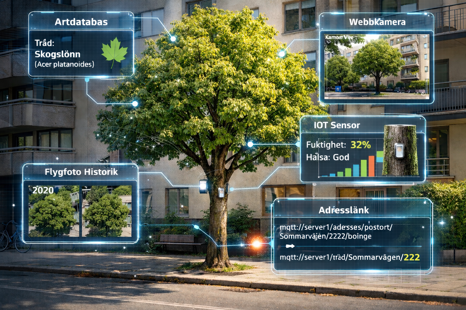 Olika system kan ha olika data om trädet ovan. Trafikkontorets databas kan innehålla art och placering. När trädet planterades osv. Flygfoton han med årsintervallet ge oss data om hur trädet växt över tid. IoT sensorer kan ge oss realtids information om trädet behöver vattnas. En webbkamera kan användas för att att se om trädet har löv eller inte. När det tappade löven på hösten osv. Börjar men leta finns det oändligt med information om olika objekt i staden sprid över olika system.
