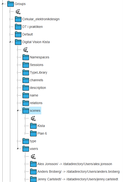 Går vi ner i grupp kanalen så ser vi att gruppen Digital Vision Kista finns representerad. Det finns en underkanal som listar scenerna i gruppen. Kista är utomhus vyn och Plan 6 är en inomhus vy i Electrum bygganden. Under users så ser vi även vila som är med i gruppen. Mappen innehåller länkar som i sin tur pekar på kanaler som ligger i Users katalogen som var med i den första bilden högre upp. Öppnar vi någon av scenerna så hittar vi därunder lagren som scenen innehåller under lagren objekten under objekten egenskaperna osv. Alla dessa är dock i sig själv objekt.