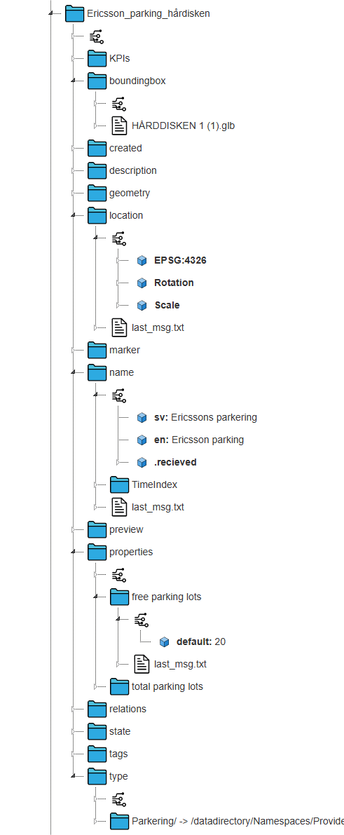 I exemplet så ser vi en av Ericssons parkeringar i Kista Hårddisken. De två viktigaste egenskaperna är namn som lagras i kanalen name och type.