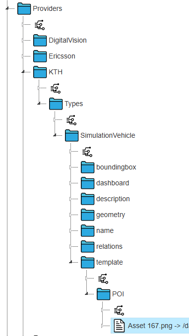 Det finns även en kanal under type objektet som heter template. Alla saker som placeras i template kommer att kopieras över objekten som är definierad att vara av den aktuella typen. På så sätt så behöver vi inte skapa en POI för varje objekt av en viss typ utan kan bara lägga en POI i template kanalen för dess typobjekt. För KTHs simulering av fordon där det finns 1000tals objekt så vore det opraktiskt att ladda upp en icon i POI kanalen för vart ett av dessa. Nu kan vi istället bara definiera typen SimulationVehicle och där efter skapa i den kanalen skapa template/POI och lägga den icon som alla simulerade bilar ska ha där.