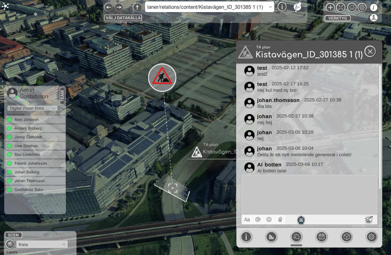 Som en sista del i projektet så började vi också att utforska hur vi med olika chatbottar kan förstå datat i den digitala tvillingen. MQTT är ett realtidssytem med kanaler och passar därför ypperligt för att skapa chatfunktioner eller sammarbetsfunktioner där en användare kan ändra någonting och övriga användare direkt ser förändringen. Detta ger möjligheter att skapa en samerbetsplattform där vi likt verktyg som Mural kan se andras digitala positioner eller likt google docs kan skriva på samma tex i realtid.