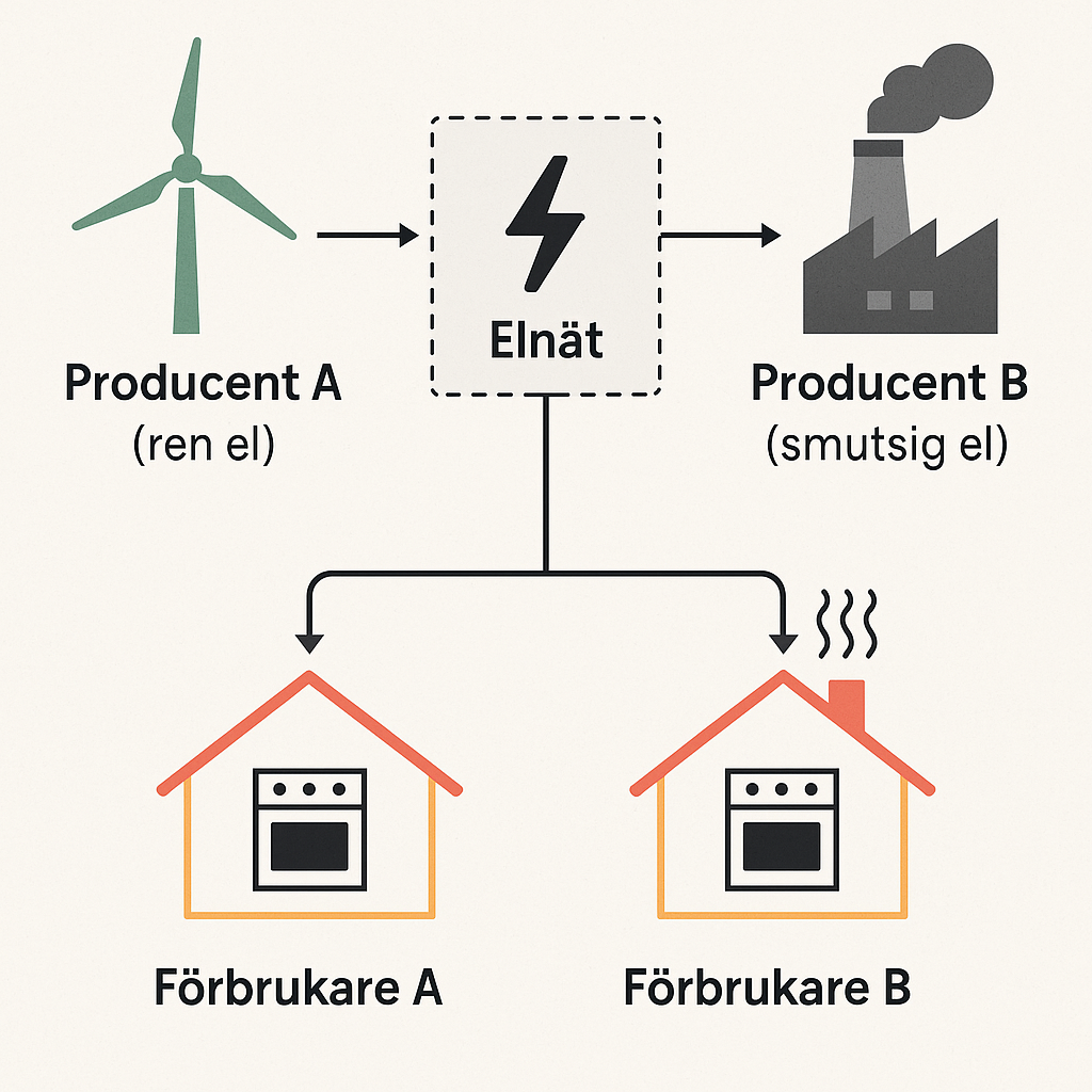 Att beräkna utsläppen från el eller andra energislag, som till exempel fjärrvärme, visar sig snabbt vara mer komplicerat än man först kan tro. Energisystemet är komplext och väcker lätt filosofiska frågor om vem som egentligen bär ansvar för vilka utsläpp. Ett enkelt tankeexperiment räcker för att illustrera problemets kärna.