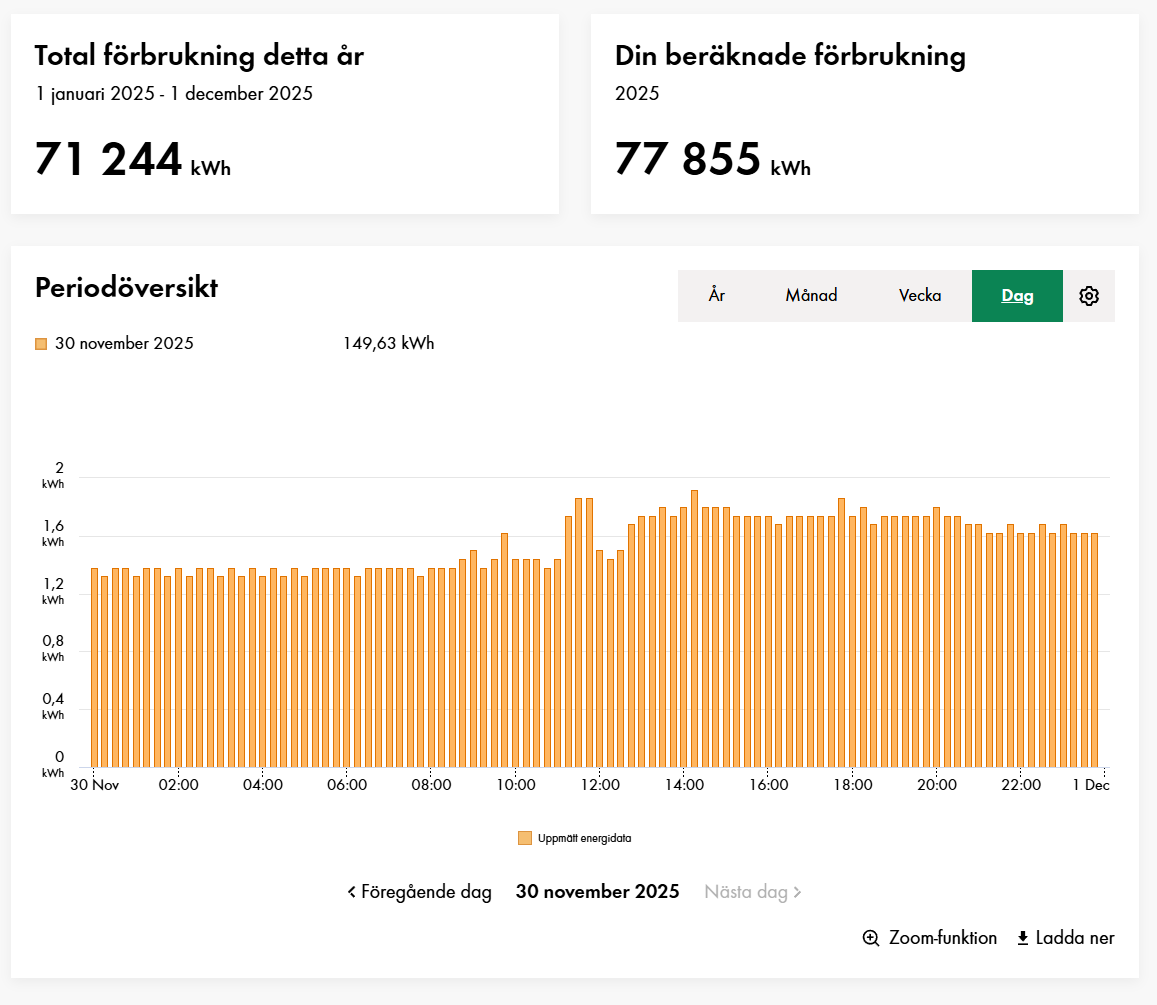 - Om du klickar på det aggregerade datat för alla dina elmätare kan det även finnas begräsningar i upplösning. Medan vi får 15 minuters data för en enskild elmätare kan vi bara titta på månadsvärden för totalen.